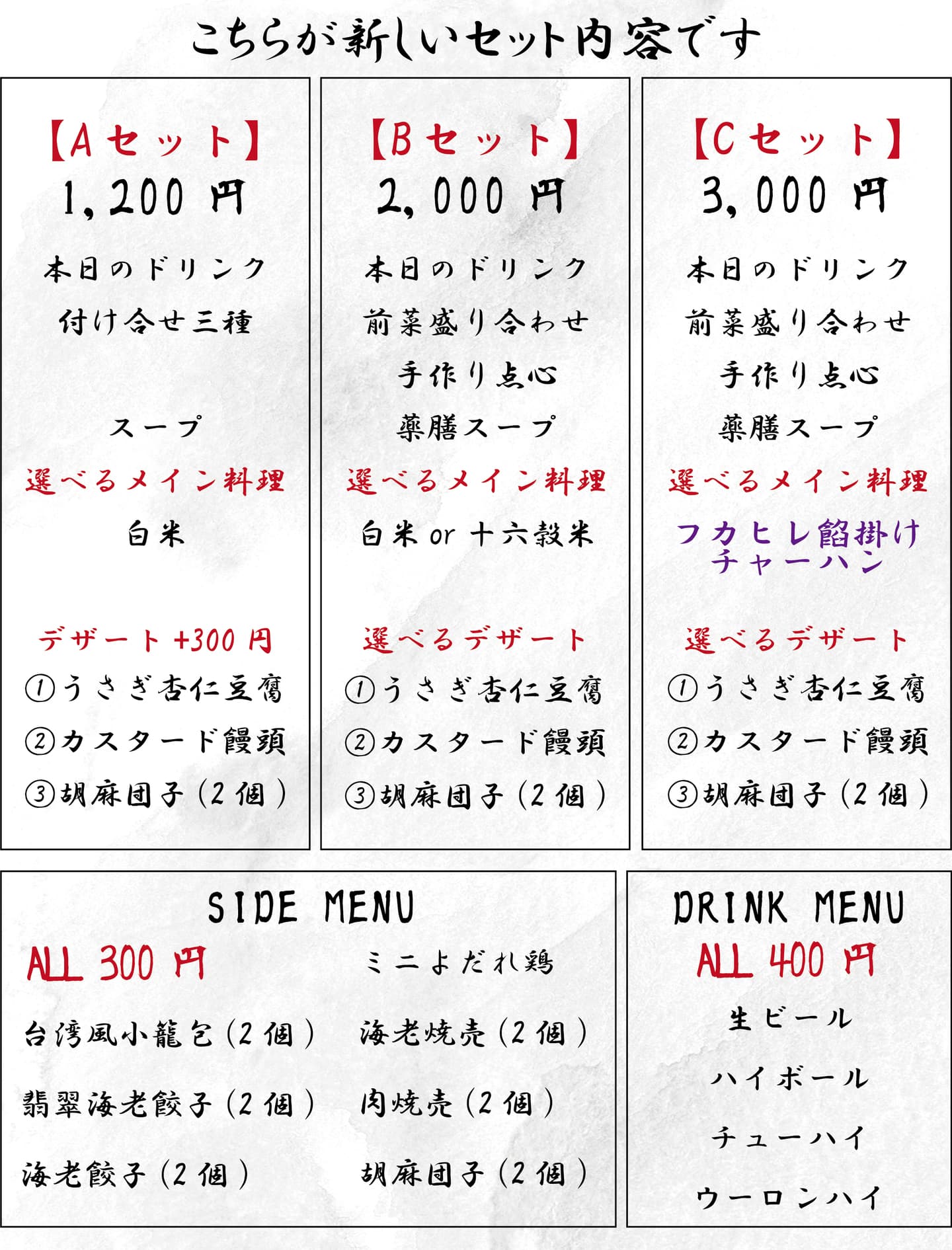 それにともない豪華フカヒレ炒飯セットも追加し、既存セットも含めた3つのセットから、お好きな内容をお選びいただくスタイルへと変更いたしました。
