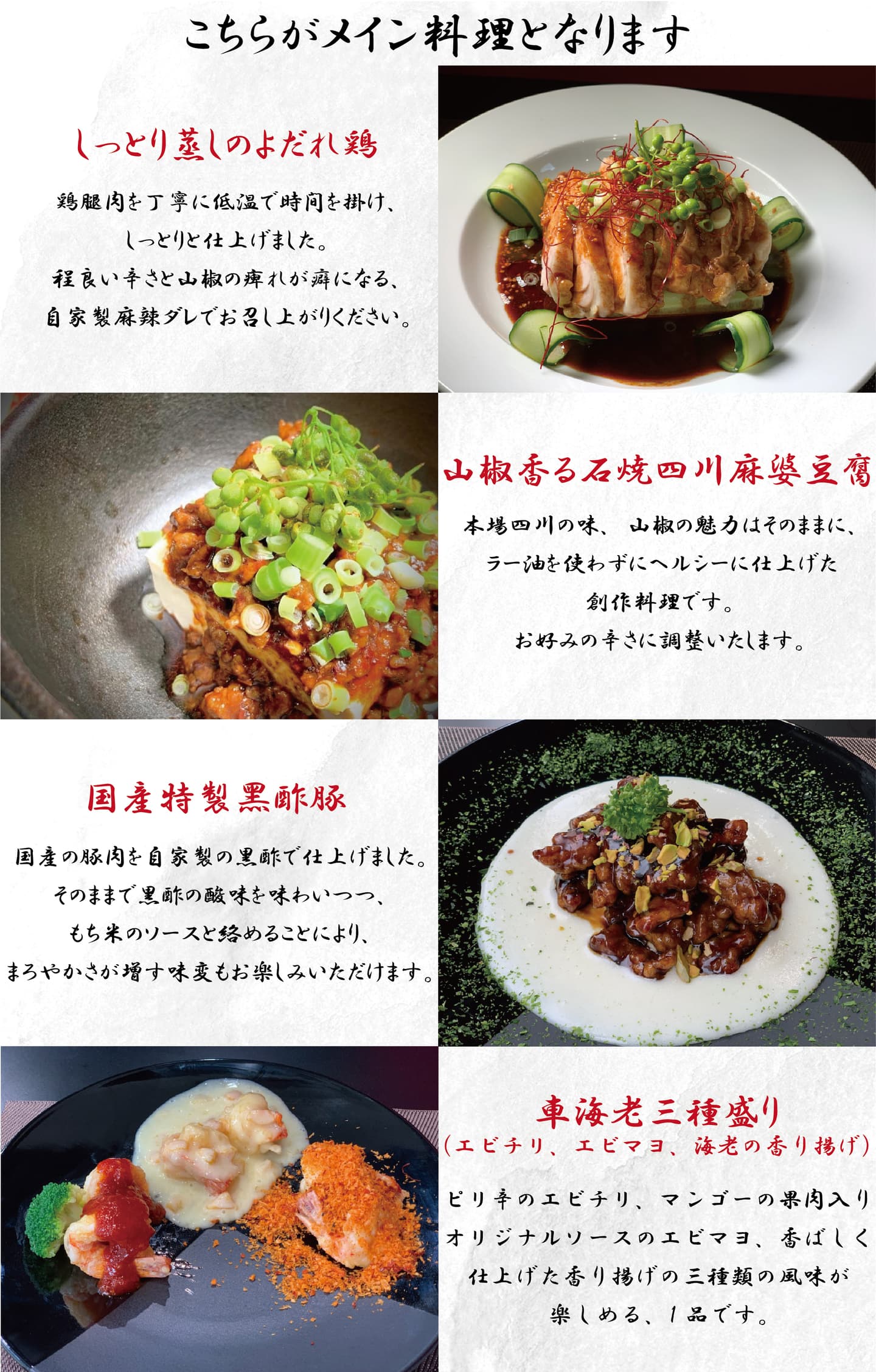 健康食とは離れたイメージを持たれる中華料理ですが、麗では様々な理由から制限をお持ちのお客様にも、外食を楽しんでいただきたいと思っております。
